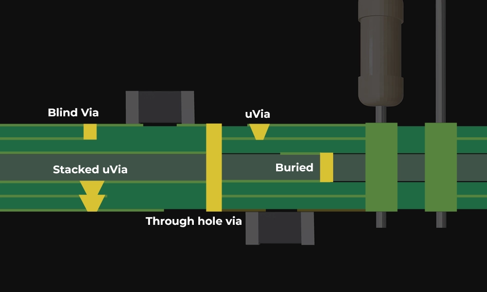 A practical guide to the four main PCB via types — through-hole, blind, buried, and microvia — covering how each is fabricated, their cost and signal-integrity trade-offs, and when to use them based on layer count, BGA pitch, and routing density.