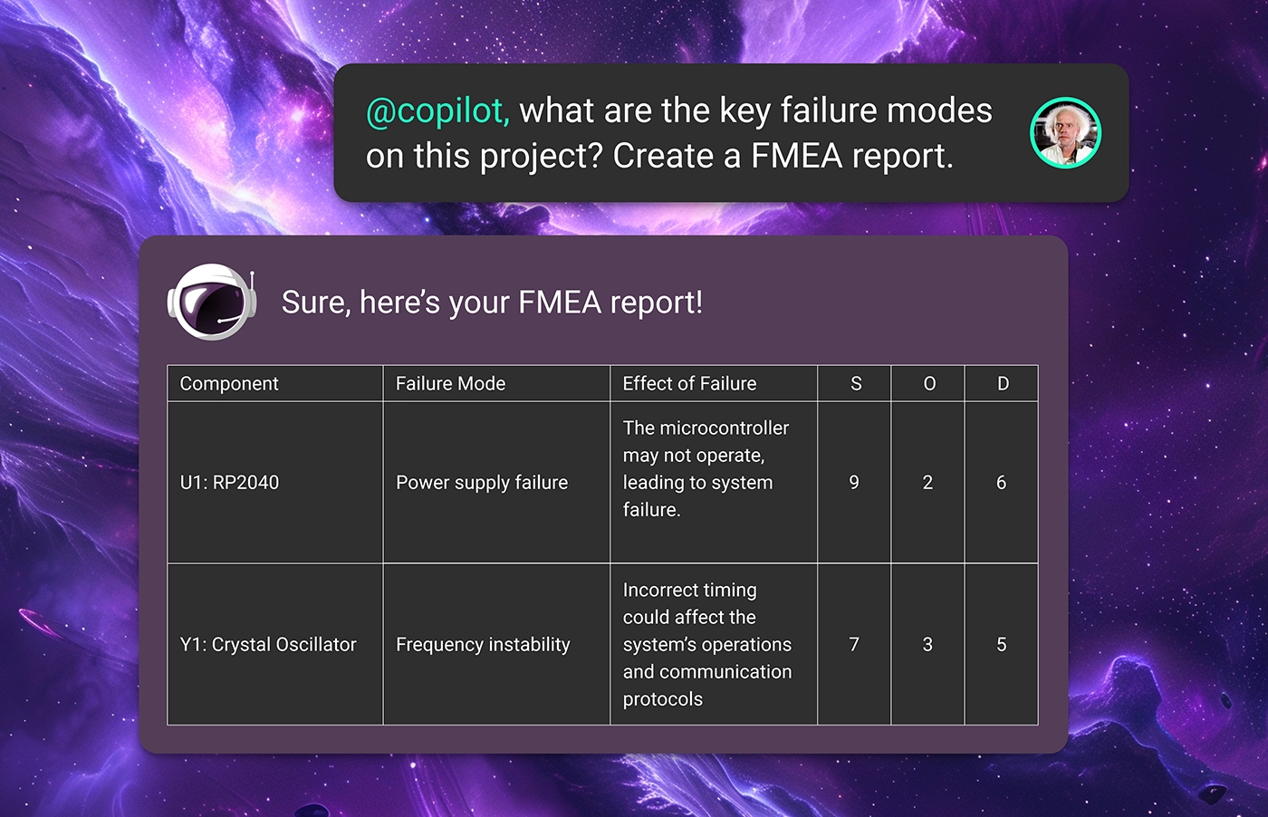 Copilot understands the detailed interplay between all the components in your design and has expert-level knowledge of electronics fundamentals. It uses this expertise to identify which signals are most critical and which are likely to fail based on conventional EE concepts and the specifics of your design.