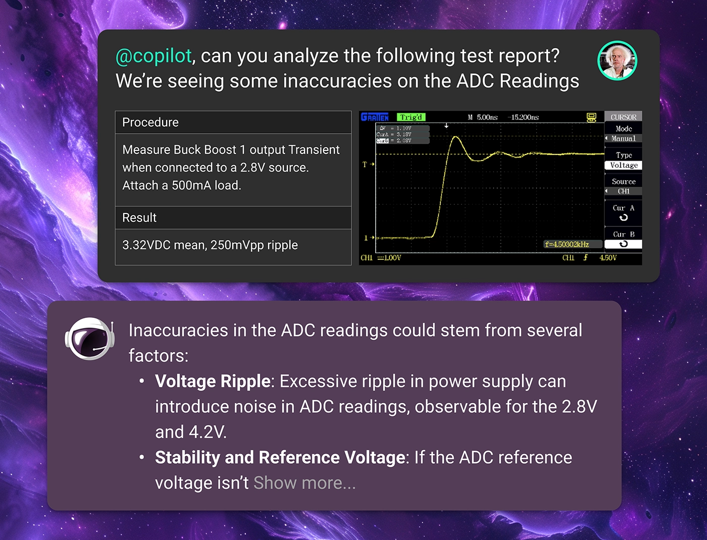 You can directly provide Copilot with the results from your test. For example, you can attach a screenshot of your oscilloscope’s capture to give it more context. Your prompt might then look something like this