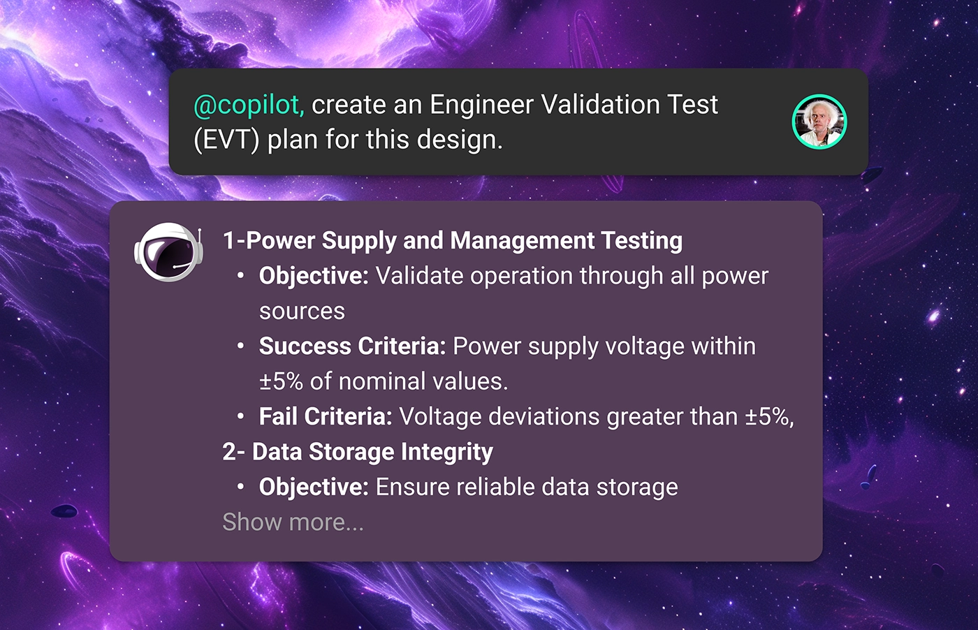 Copilot helps your team answer all of these questions by developing comprehensive and robust test plans for your design. Simply prompt Copilot with a question like
