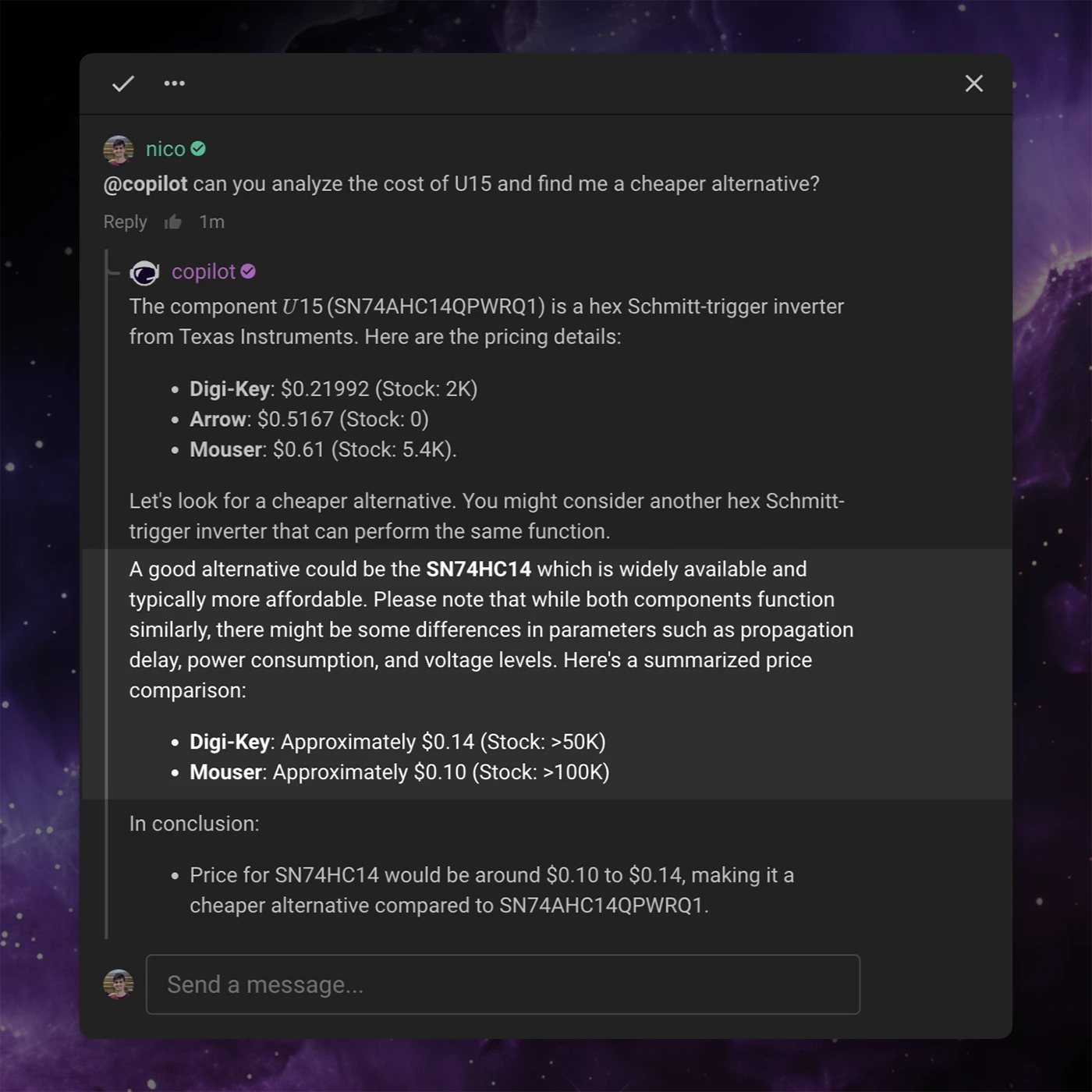 Copilot will then scour the internet and the Flux library, searching for the best component replacements that save you money without sacrificing your original design’s functionality. You no longer have to do all the manual work yourself. No more need to open a dozen tabs, clicking between datasheets and suppliers to find the best alternates. Instead, Copilot automates the whole process for you so that you can feel confident you have the most cost-efficient design possible.