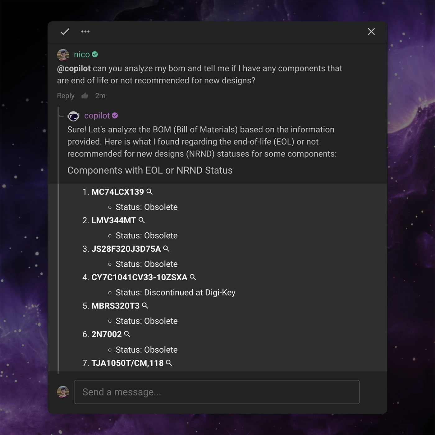 “@copilot, please analyze my bill-of-materials to check if any of my components have reach end-of-life, or if they’re at risk to do so”.