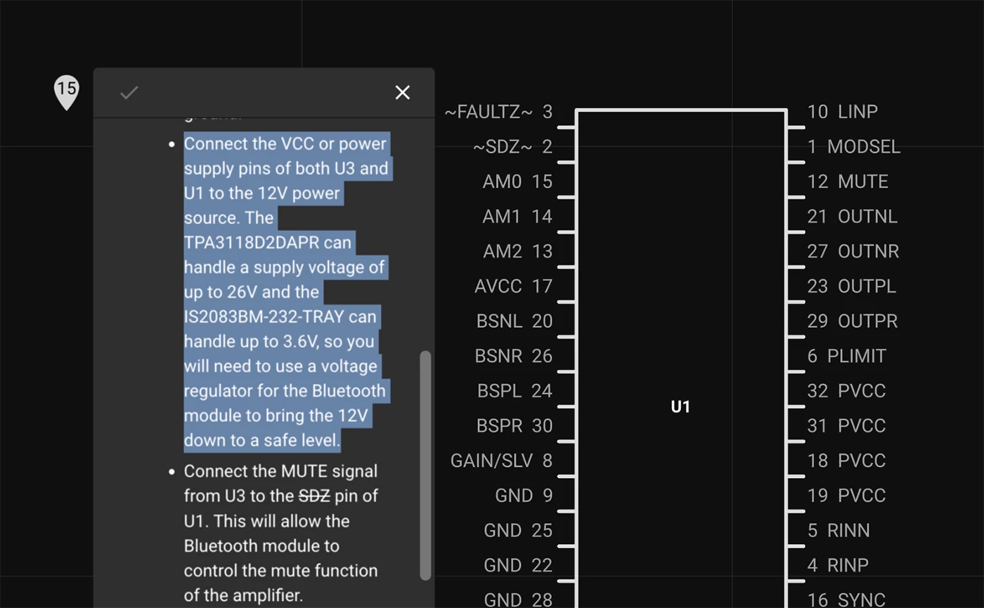 While working on the Audio Amplifier project, I asked Copilot to connect U3 to U1, assuming that was the correct move. With its understanding of our specific project requirements, Copilot quickly identified that I’d need a voltage regulator for the Bluetooth module. This correction brought the 12V down to a safe level, ensuring our design complied with the energy efficiency requirement.