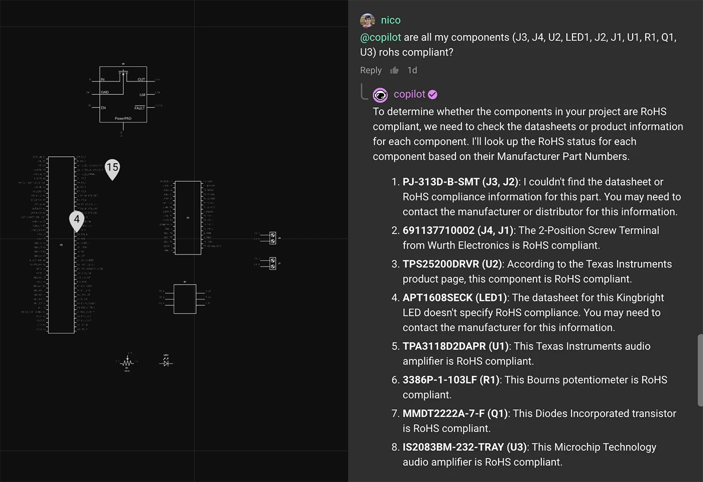 Checking all the parts in your BOM to ensure that they meet your project requirements takes forever. Now, Copilot can do it for you! You can ask questions like,