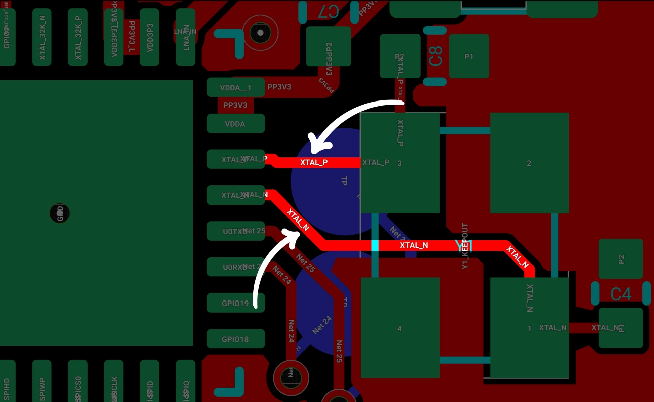 Crystal Oscillator Signal Routing: Auto-Layout ensures crystal oscillator signals take the shortest path to the clock input, reducing degradation and interference, while maintaining safe distances from other nets.